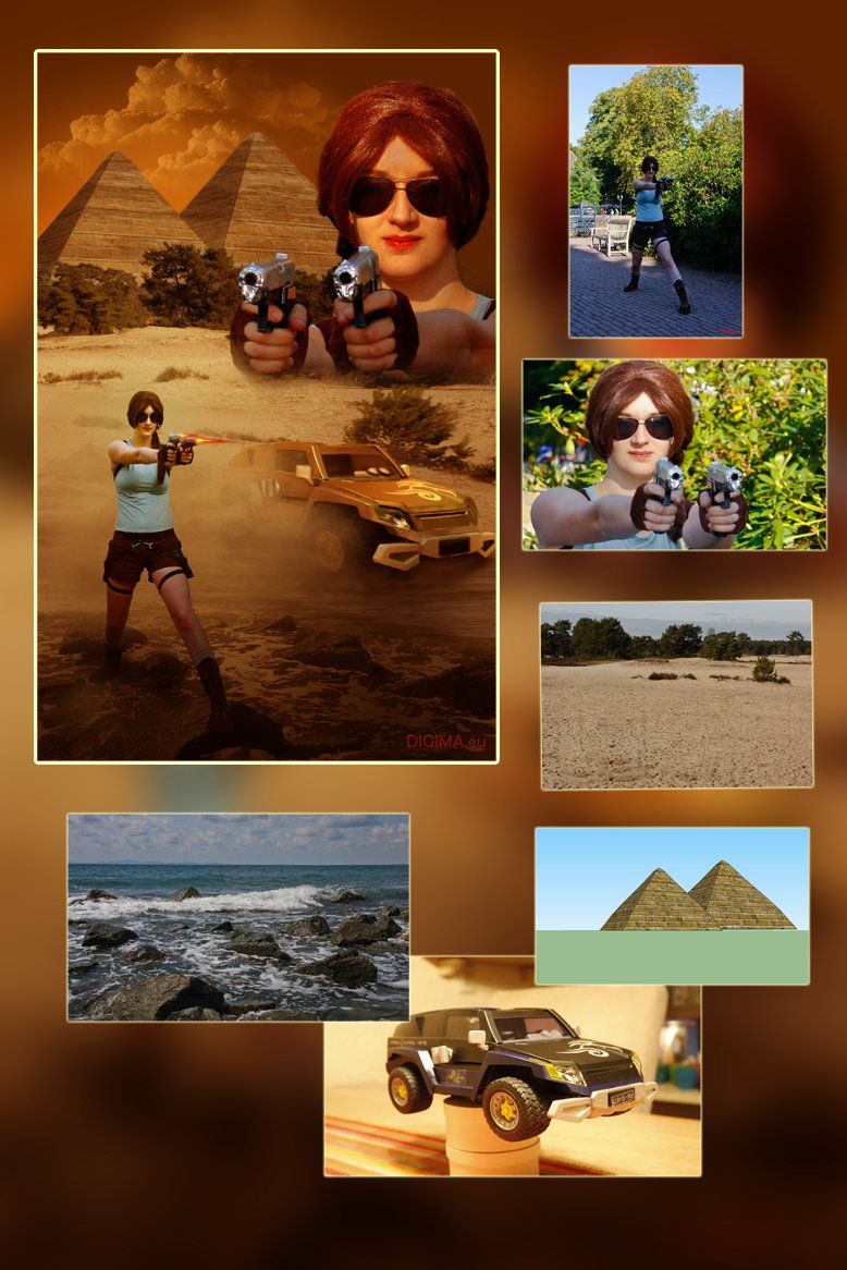 Onderstaande bewerking is een combinatie van foto's genomen op Elfia in Arcen, natuurfoto in de Maasduinen, de piramides zijn 3D getekend (sketch-up), kust in Bulgarije en een speelgoed auto gefotografeerd op de keukentafel.